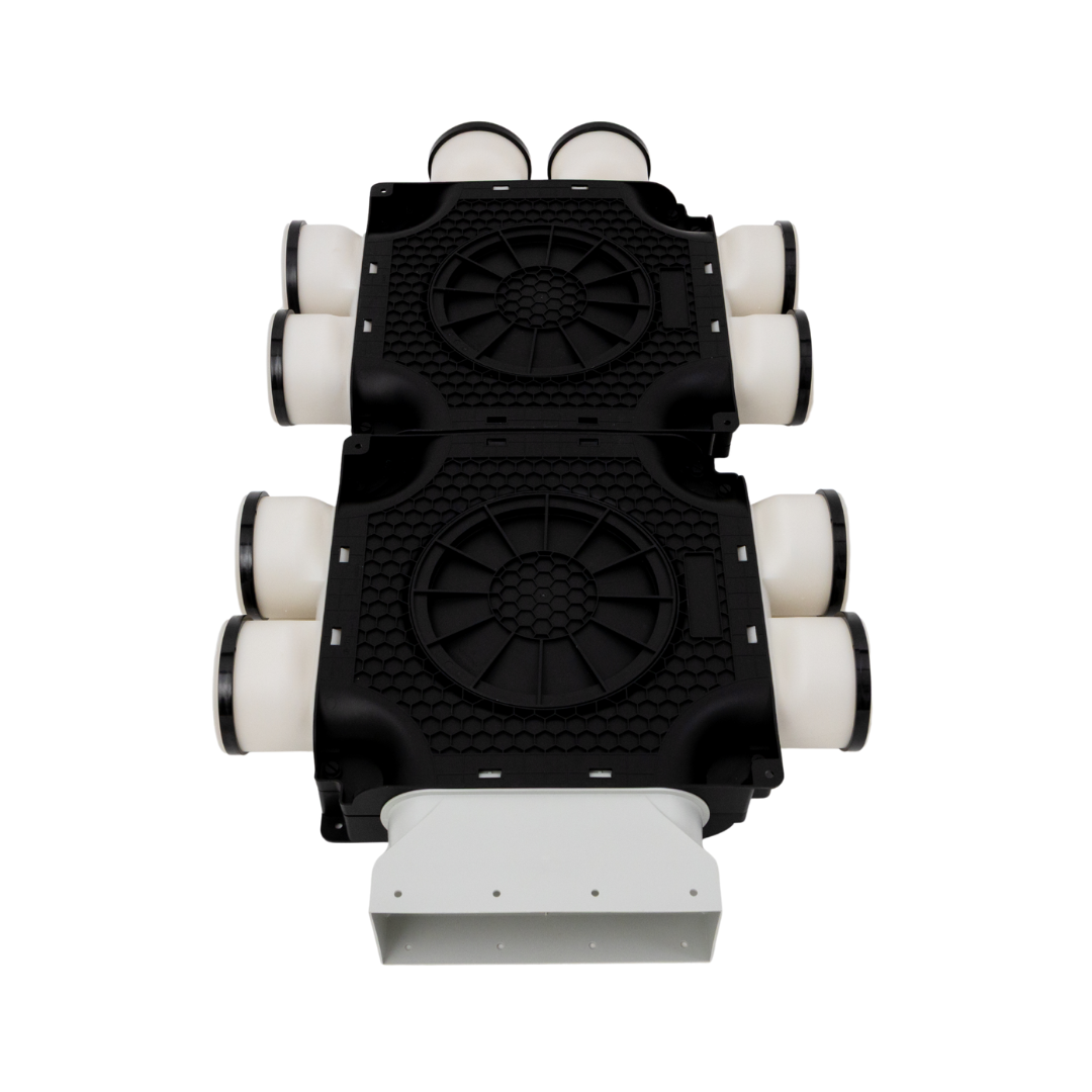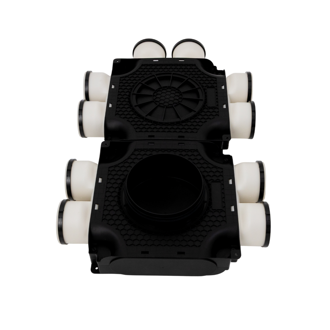 De luchtverdeelbox met 10 aftakkingen Ø90 mm is een centraal verdeelcomponent binnen het Distrivent luchtverdeelsysteem en wordt toegepast voor het gelijkmatig verdelen van ventilatielucht naar meerdere luchtkanalen.