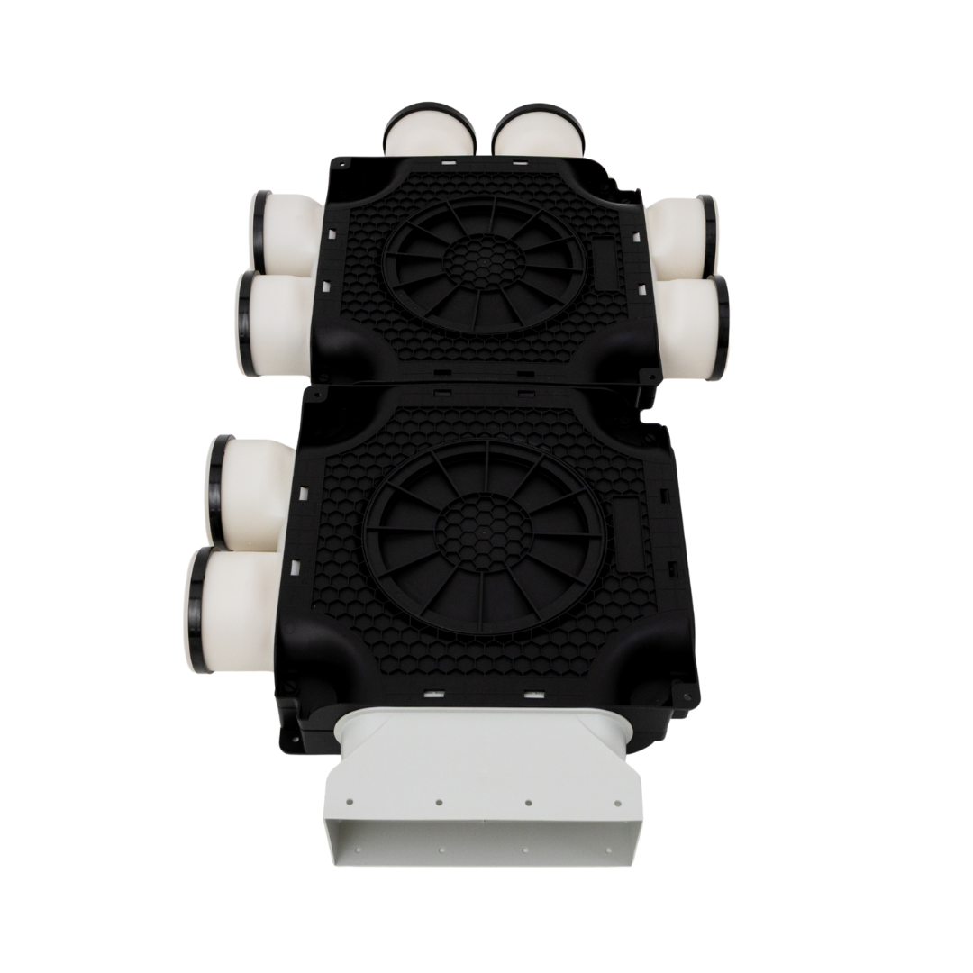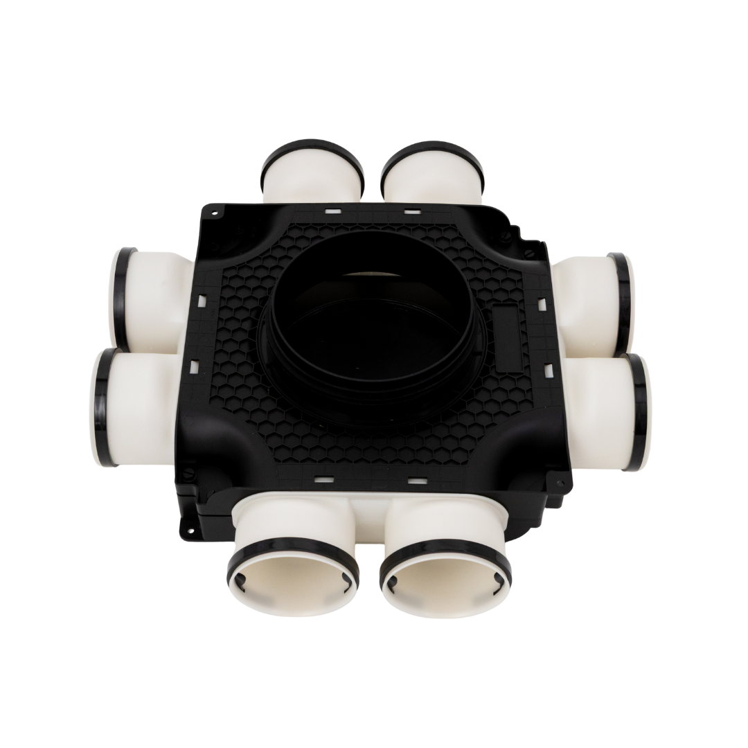 De luchtverdeelbox met 8 aftakkingen Ø90 mm en een hoofdaansluiting Ø160 mm is een centraal verdeelcomponent binnen het Distrivent luchtverdeelsysteem, geschikt voor instorten in beton en ontworpen voor een luchtdichte, hygiënische en efficiënte verdeling van ventilatielucht.