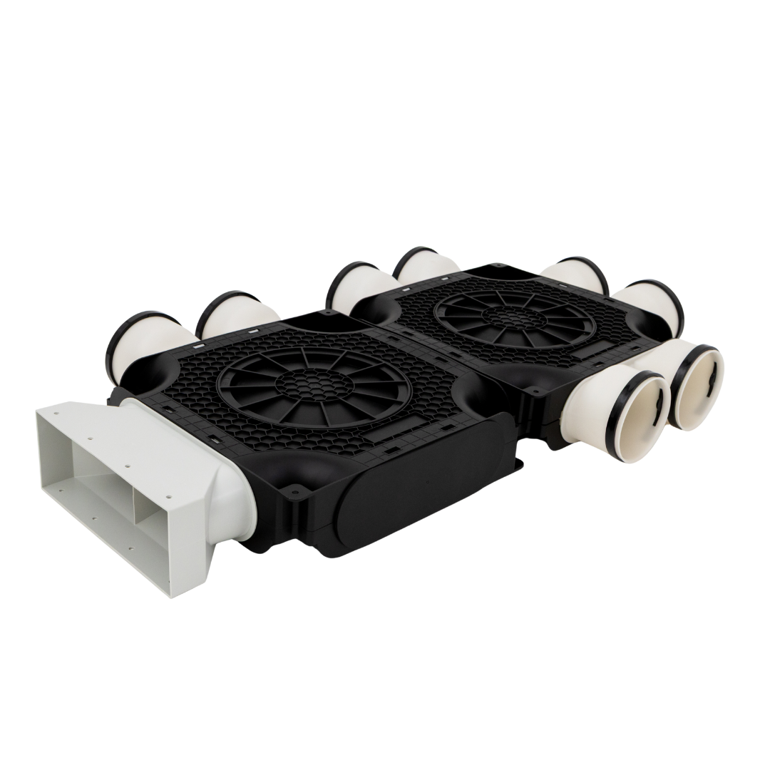 De verdeler is vervaardigd uit recyclebaar polypropyleen (PP) en geschikt voor verwerking in vloeren, inclusief instorten in beton. Het antistatisch behandelde binnenoppervlak beperkt stofaanhechting en draagt bij aan een hygiënische luchtstroom. De luchtverdeelbox voldoet aan luchtdichtheidsklasse D, waardoor luchtverliezen minimaal blijven en het ventilatiesysteem efficiënt functioneert.